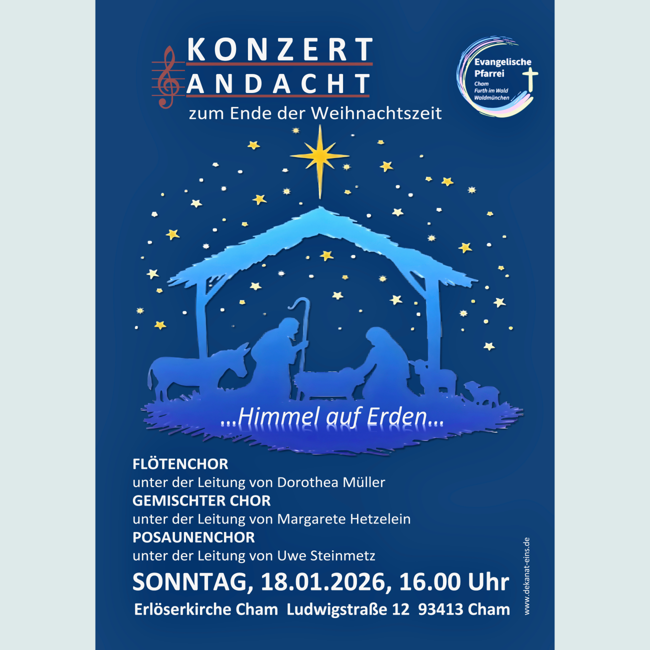 Am 18.01.2026 um 16.00 Uhr findet in der Erlöserkirche Cham ein besonderes Konzert zur ausklingenden Weihnachtszeit statt: "Himmel auf Erden". Im Kirchraum verteilt führen die drei Chöre der Gemeinde europäische Kompositionen zur ausklingenden Weihnachtszeit und zum neuen Jahr aus fünf Jahrhunderten auf. Mitwirkende: Der Flötenchor unter der Leitung von Dorothea Müller, der Gemischte Chor unter der Leitung von Margarete Hetzelein und der Posaunenchor unter der Leitung des Dekanatskirchenmusikers Uwe Steinmetz.